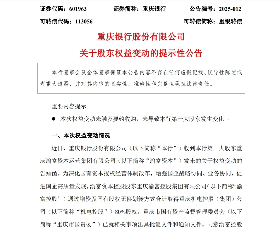 3月3日,重庆银行发布关于股东权益变动的提示性公告。公告中提到,第一大股东重庆渝富资本运营集团有限公司(渝富资本)通过增资及国有股权无偿划转方式,合计取得重庆机电控股(集团)公司80%股权,并将轻纺集团的股权进行无偿划转。此次权益变动未触及要约收购,也未导致第一大股东发生变化。