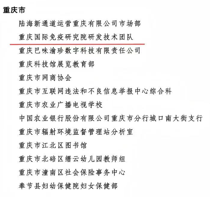 日前,全国妇联决定,授予10人全国三八红旗手标兵称号,授予596人全国三八红旗手称号,授予395个单位全国三八红旗集体称号,授予599个单位全国巾帼文明岗称号。重庆国际免疫研究院研发技术团队获全国巾帼文明岗称号。
