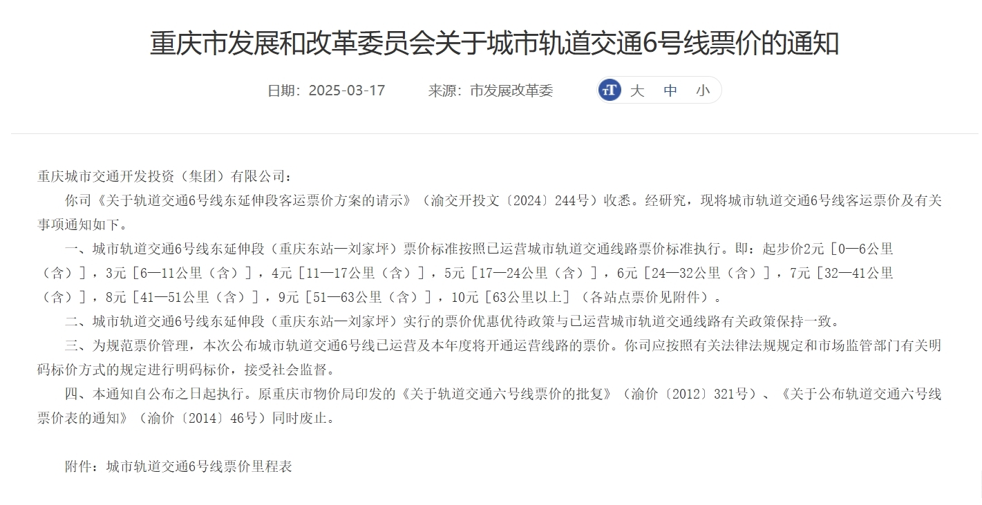 近日,重庆市发展改革委发布消息,轨道交通6号线东延伸段(重庆东站—刘家坪)票价方案已正式确认,将按照已运营城市轨道交通线路票价标准执行。即起步价2元,按里程递增至最高10元,该方案自公布之日起执行,原相关票价文件同步废止。