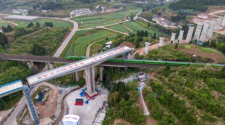 新建成都至达州至万州高速铁路(以下简称:成达万高铁)大通镇跨达成铁路特大桥由中铁十二局承建。位于南充市嘉陵区,全长783.54米,转体梁长121米、梁面宽12.6米、转体总重量达11000吨。据介绍,达成铁路日均开行列车105对,平均3至5分钟就有一趟列车通过,列车运行密度大,为最大限度减少对营业线的影响,建设者们采用平行营业线浇筑梁体后再转体的方案。