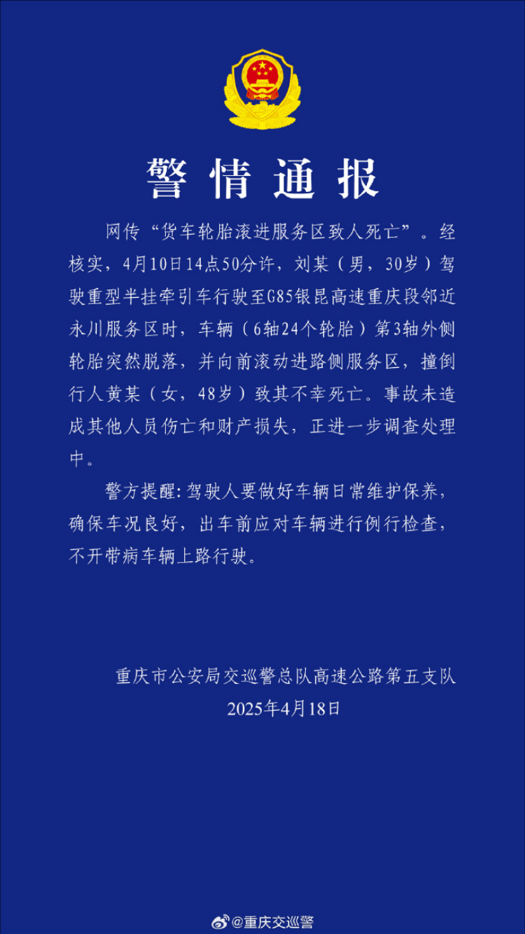 重庆交巡警18日发布警情通报,网传“货车轮胎滚进服务区致人死亡”。经核实,4月10日14点50分许,刘某(男,30岁)驾驶重型半挂牵引车行驶至G85银昆高速重庆段邻近永川服务区时,车辆(6轴24个轮胎)第3轴外侧轮胎突然脱落,并向前滚动进路侧服务区,撞倒行人黄某(女,48岁)致其不幸死亡。事故未造成其他人员伤亡和财产损失,正进一步调查处理中。