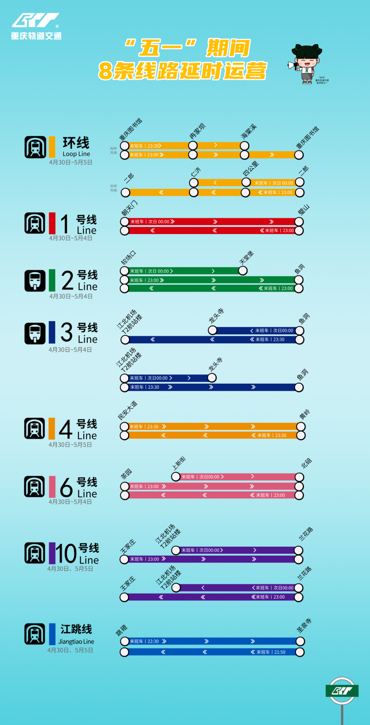 5月1日至5月4日,1号线(朝天门→璧山)、2号线(较场口→天堂堡)、3号线(江北机场T2航站楼⇆鱼洞,江北机场T2航站楼→龙头寺,鱼洞→龙头寺)延长运营60分钟;6号线(上新街→北碚)延长运营40分钟;4号线(民安大道⇆黄岭)、环线(重庆图书馆→冉家坝→重庆图书馆、二郎→四公里→二郎,重庆图书馆→冉家坝→海棠溪,二郎→四公里→仁济)延长运营30分钟。