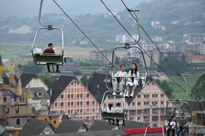 五一假期期间,美心红酒小镇景区结合“坐着索道环游春天”的主题,为游客提供了丰富多彩的游乐体验。长达近10公里的索道环线备受欢迎,游客们乘坐索道,不仅能从空中俯瞰长江,穿越河流与高速,登上春山,感受独特的空中踏青体验,还能在20个特色春游景点中,欣赏彩色小镇、郁郁翠林、葡萄田园等春日美景。