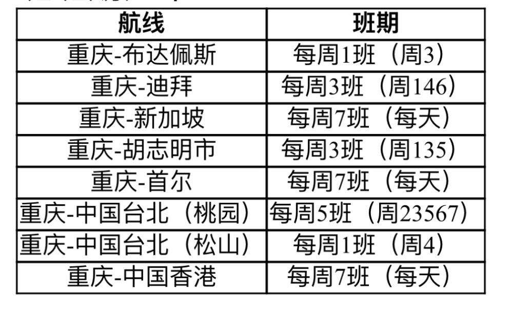 目前,国航在重庆的国际/地区航线共计9条,除重庆=东京外,其他国际/地区航线航班班期如下: