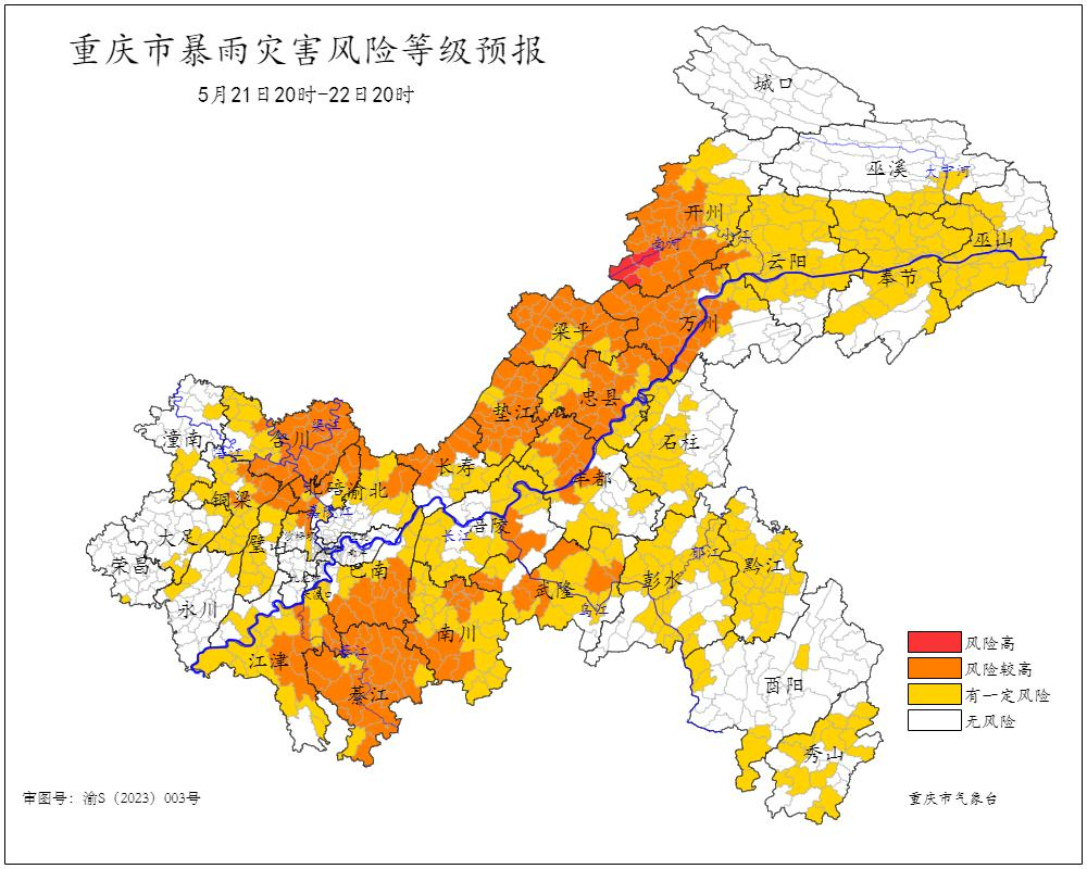 5月21日12点,重庆市气象局继续发布暴雨灾害Ⅳ级预警,与5月20日发布的暴雨灾害预警情况相比,我市东北部地区雨量预报调整为大到暴雨,局地大暴雨,暴雨灾害风险也相应调整,其余地区预报结论基本一致。