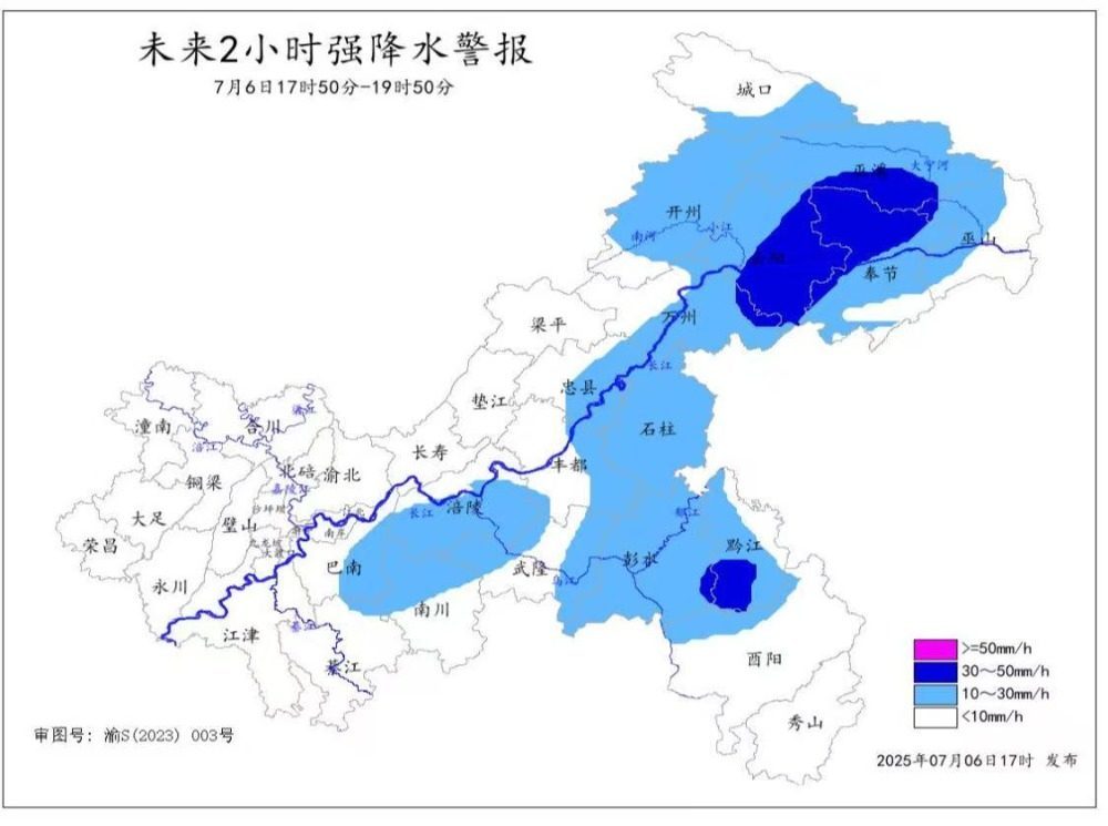 7月6日,市气象台发布未来2小时强降水警报,预计7月6日17:50-19:50,万州、云阳、奉节、巫溪、巫山、彭水、黔江、酉阳等8个区县小时雨强将达30-50毫米,巴南、綦江、万盛、南川、涪陵、丰都、忠县、开州、城口、武隆、石柱小时雨强将达10-30毫米,上述地区局地伴有雷电、阵性大风,请注意防范。