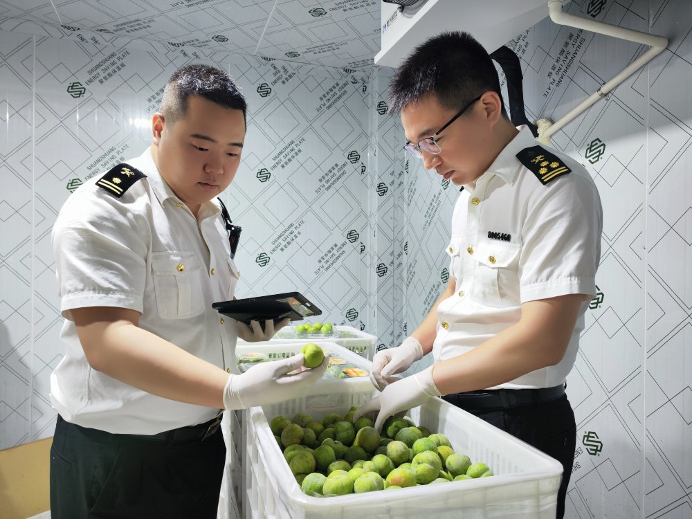 ▲重庆海关所属万州海关关员对出口巫山脆李开展现场监管。受访单位供图