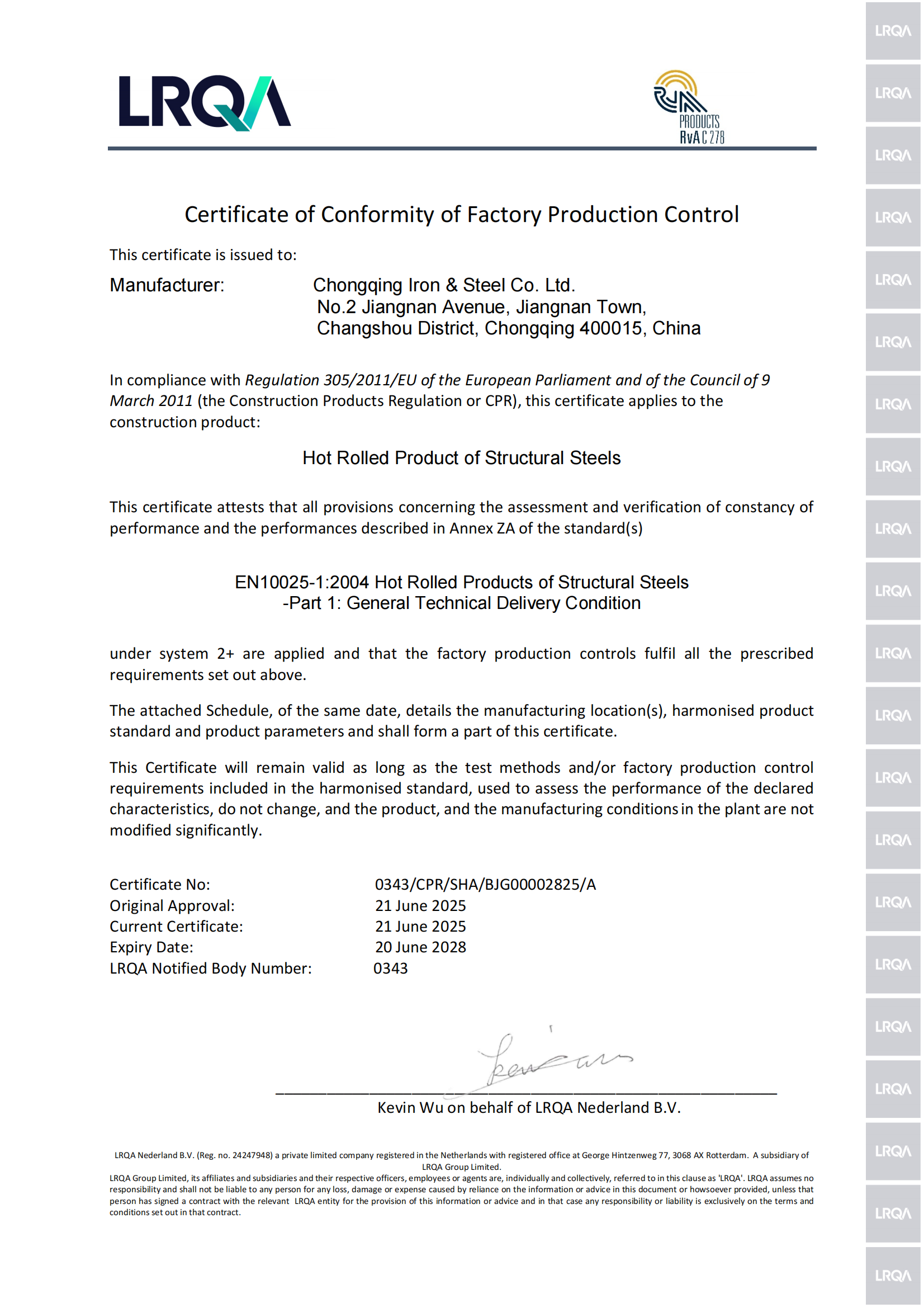 最终欧盟认证机构对重庆钢铁的质量管理体系、生产流程及产品性能等均给予高度评价,并颁发相应认证,重庆钢铁质量管理体系及产品性能已全面符合欧洲标准要求。