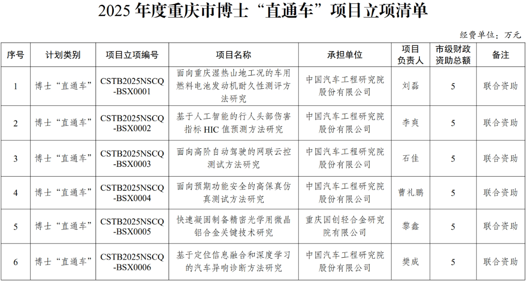 记者从立项清单中发现,2025年度重庆市博士“直通车”项目共立项26项,每项资助10万元。这些项目覆盖新能源汽车与人工智能、新材料与先进制造、能源环保和生物医药等多个领域,其中包括《基于人工智能的行人头部伤害指标HIC值预测方法研究》《锂电池系统热失控机理分析及其AI预警方法研究》《发展可用于肿瘤发生过程精细研究的超高特异性双重组酶小鼠模型》等前沿课题。