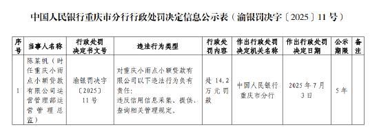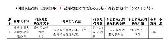 近日,据中国人民银行重庆市分行行政处罚决定信息公示表显示,重庆小雨点小额贷款有限公司因违反信用信息采集、提供、查询相关管理规定,被处249.1万元罚款。