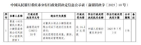 同时,曹某(时任重庆小雨点小额贷款有限公司风控中心首席风控官)对重庆小雨点小额贷款有限公司以下违法行为负有责任:违反信用信息采集、提供、查询相关管理规定,被处14.2万元罚款;陈某帆(时任重庆小雨点小额贷款有限公司运营管理部运营管理总监)对重庆小雨点小额贷款有限公司以下违法行为负有责任:违反信用信息采集、提供、查询相关管理规定,被处14.2万元罚款。