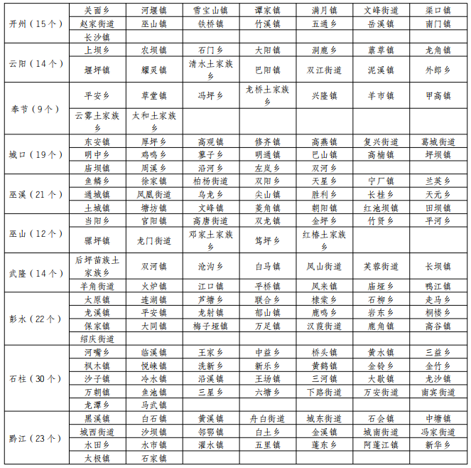 高风险区:梁平、忠县、万州、开州、云阳、奉节、城口、巫溪、巫山、石柱