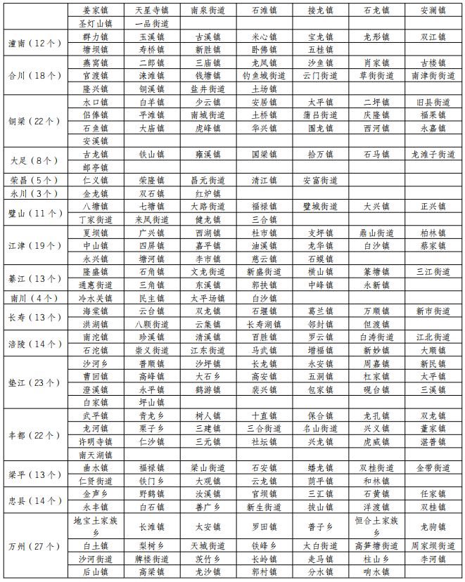 较高风险区:沙坪坝、北碚、渝北、巴南、潼南、铜梁、大足、荣昌、永川、璧山、江津、綦江、南川、长寿、涪陵、垫江、武隆、彭水、黔江