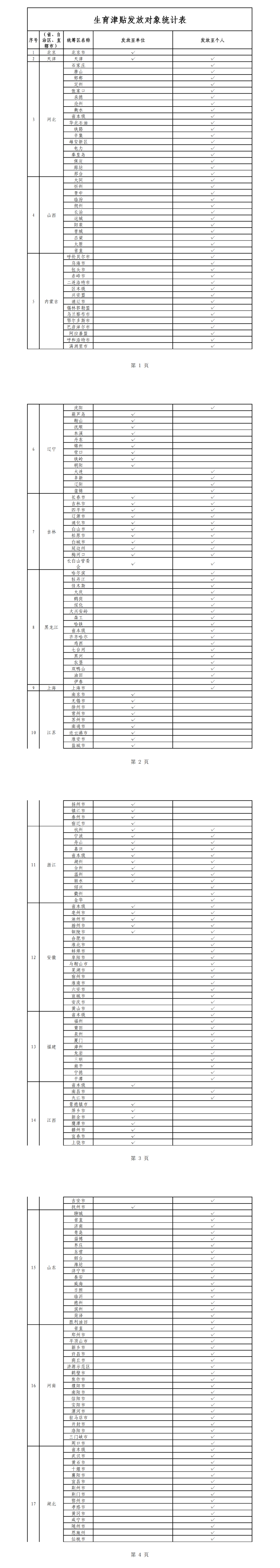 国家医保局积极推进各地医保部门优化生育津贴发放流程,持续调度推进生育津贴直接发放至个人,切实提升群众的获得感与满意度。自6月以来,河北、浙江、吉林、云南、河南等省又相继在全省全面推开生育津贴发放至个人。四川省也已于近日正式发文,9月1日起在全省全面实现生育津贴直达个人。目前,全国有20个省份(含新疆生产建设兵团)全面实现生育津贴直接发放至个人,即河北、山西、内蒙古、吉林、黑龙江、上海、浙江、福建、山东、河南、湖北、海南、重庆、四川、云南、西藏、甘肃、青海、宁夏、新疆生产建设兵团,实现生育津贴直接发放至个人的统筹区占比将近8成。各统筹区生育津贴发放具体情况详见下表。