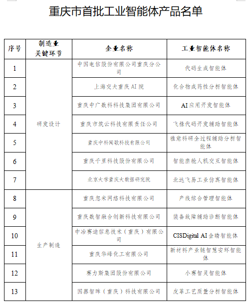 9月6日,2025世界智能产业博览会期间,重庆正式发布首批30个工业智能体产品,包括研发设计、生产制造、供应链管理、营销管理、运维服务5个大类。这批工业智能体的集中发布,是重庆响应国家人工智能战略的具体实践,也是重庆市立足制造业根基、加快AI赋能产业高质量发展的重要举措。