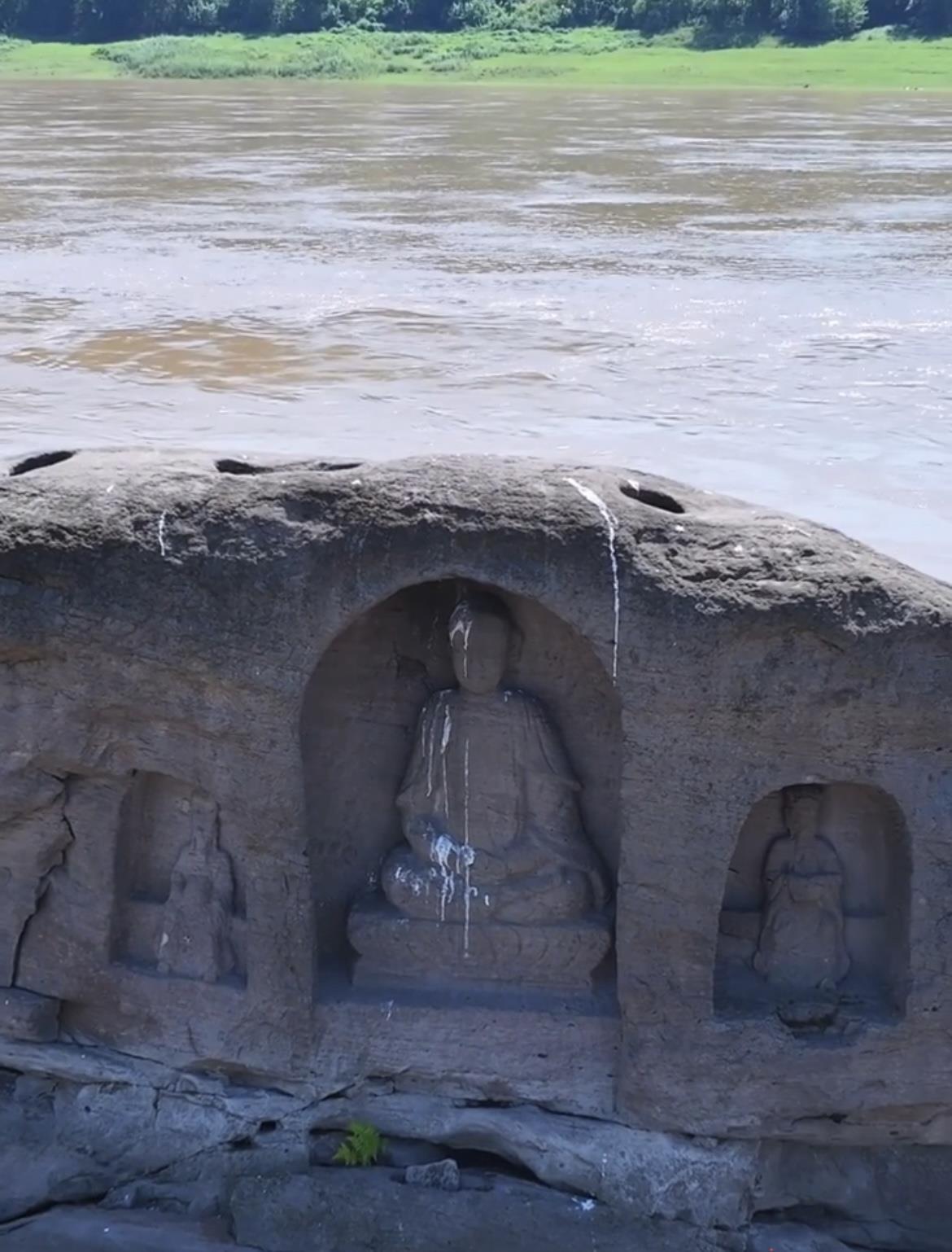 9月7日,五宝镇文化中心的张主任告诉极目新闻记者,江心岛的这几龛摩崖造像每到秋季或长江水位下降时,就会浮现出来。他曾用望远镜看过,上面共有3龛造像,形似观音,都是在石头上雕刻而成,中间一尊最大高约1米,佛像正面对着五宝镇这边。