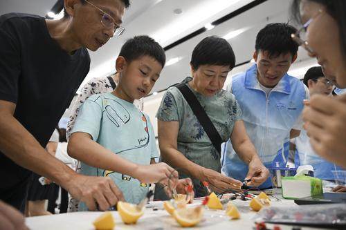 ▲2025年重庆市全国科普月主场活动现场,家长带着孩子体验水果电池。记者 谢智强 摄
