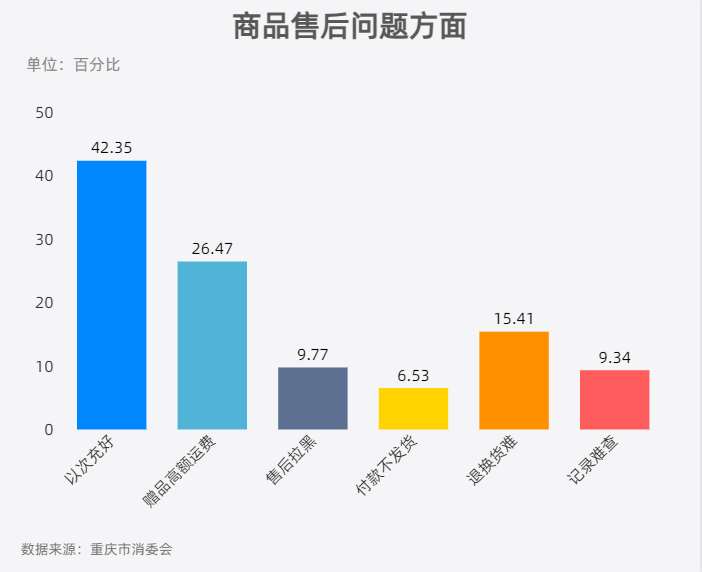 三是商品售后问题突出,权益无保障。42.35%的消费者遇到过“商品以次充好”,26.47%的消费者遭遇过“赠品高额运费”,还存在“售后拉黑(9.77%)”“付款不发货(6.53%)”“退换货难(15.41%)”“记录难查(9.34%)”等问题,全链路存在短板。