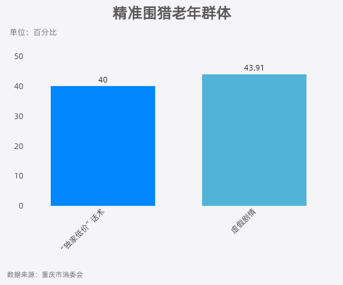 一是精准围猎老年群体。商家利用老年人信息闭塞、情感需求强、辨别弱的特点,通过“线上和线下(免费礼品、义诊)”引流至封闭私域,以“独家低价”“治病功效”话术(超40%消费者提及)、虚假剧情(43.91%消费者遭遇)实施诱导营销。