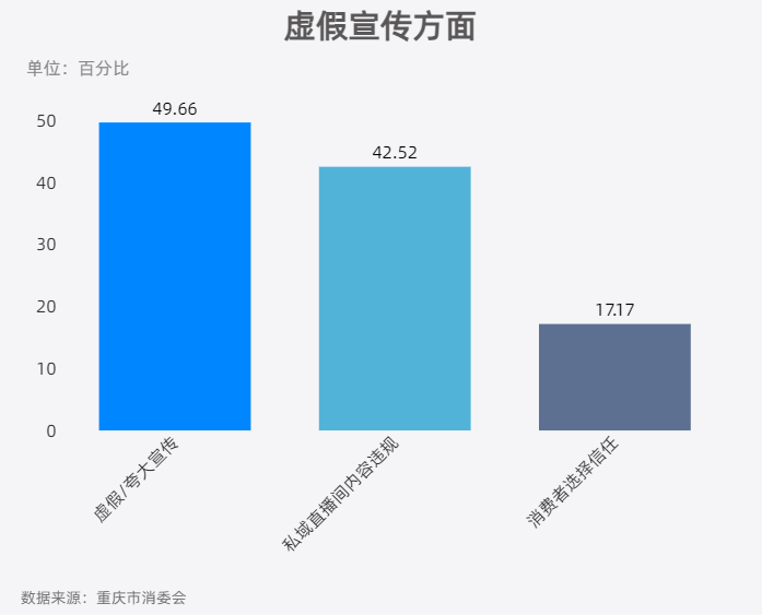 二是虚假宣传频发,信任度极低。近半数(49.66%)消费者遇到过“虚假/夸大宣传”,超四成(42.52%)消费者认为私域直播间内容存在违规现象,比如,主播常用“极限词/违禁词”、虚构原价、资质造假等;仅有17.17%的消费者选择信任,占比不足二成。