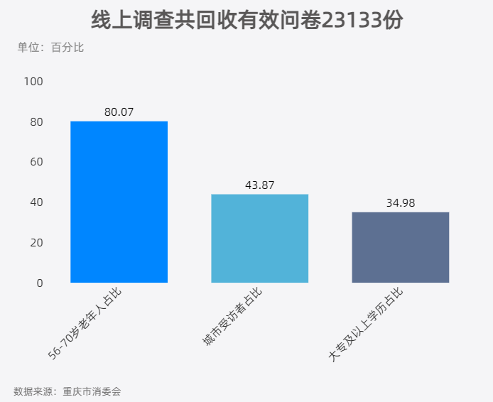 本次线上调查通过各省市消协(消委会)微信公众平台推送问卷,共回收有效问卷23133份。受访者中以56-70岁老年人为主,占80.07%;从居住地来看,城市受访者占比43.87%,略高于其他区域;从学历构成来看,大专及以上学历的老年受访者占比34.98%,反映出较高的线上调查参与积极性。线下体察则聚焦私域直播实际运营场景,深入挖掘商家引流、营销及售后全流程的问题。