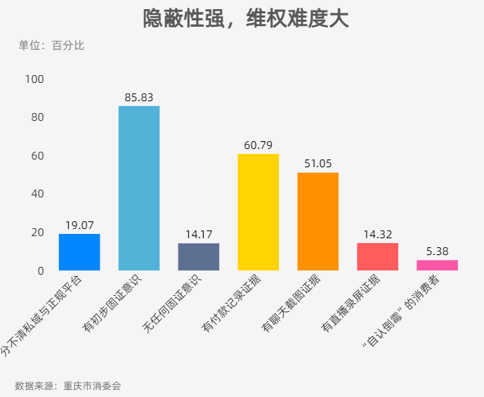 四是隐蔽性强,维权难度大。19.07% 消费者分不清私域与正规平台,增加维权难度。尽管有85.83%的消费者有初步固证意识,但证据类型集中于付款记录(60.79%)、聊天截图(51.05%),关键的“直播录屏”仅有14.32%的消费者有保存意识;此外,14.17%有消费者无任何固证意识,5.38%的消费者在权益受损后选择“自认倒霉”,进一步凸显了维权意识与能力的不足。