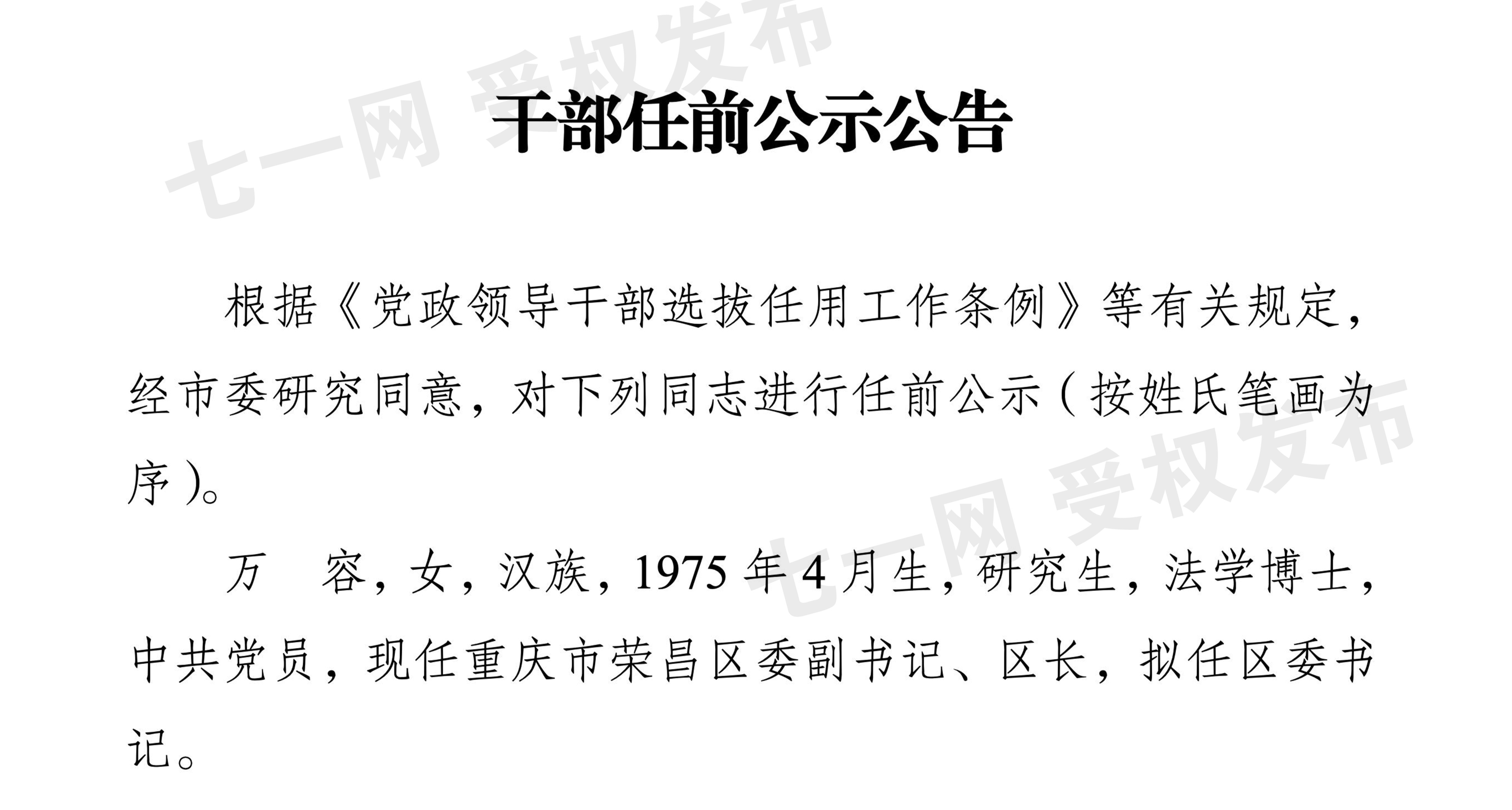 9月26日,重庆市委组织部发布干部任前公示。其中,经重庆市委研究同意,现任重庆市荣昌区委副书记、区长万容,拟任区委书记。