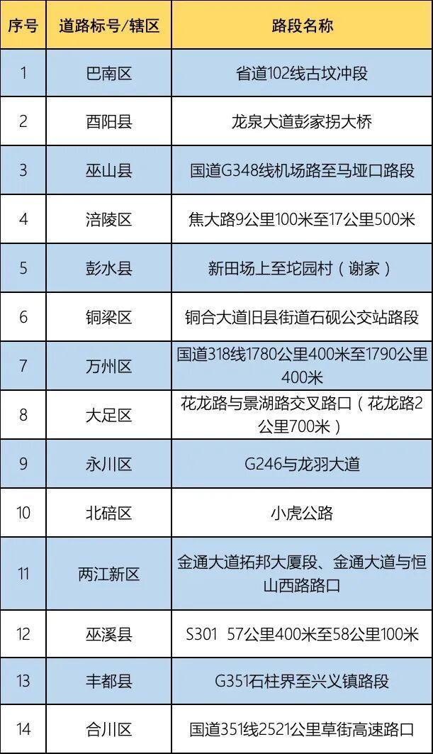 今年国庆节、中秋节共8天假期,群众出行意愿集中释放,全市客流、车流将出现大幅度增长,部分网红热门景点人员、车流聚集,加之农忙时节运输频繁,人员流动性大,假期天气以阴雨天为主,道路交通安全风险加大,重庆公安交管部门排查公布14处事故多发点(段),并发布道路交通安全风险预警提示。