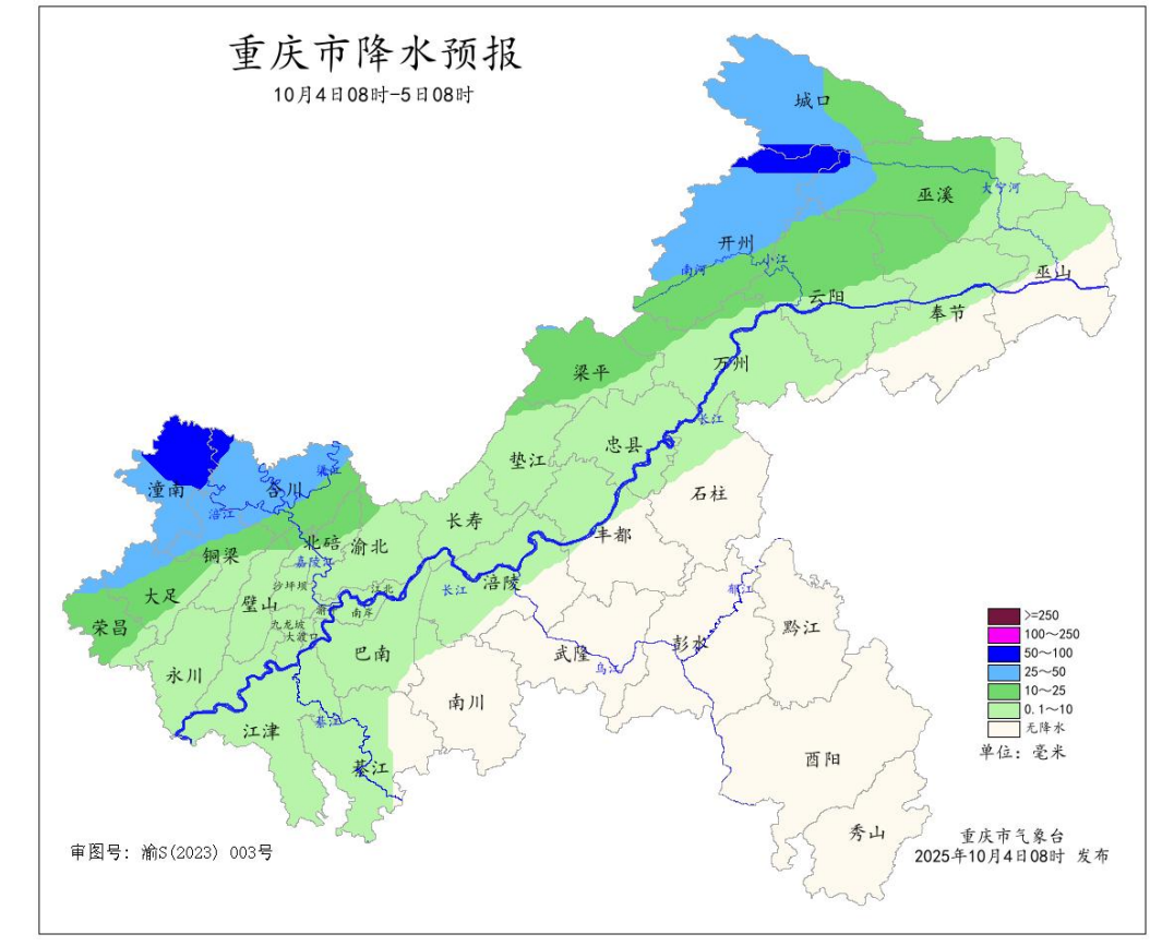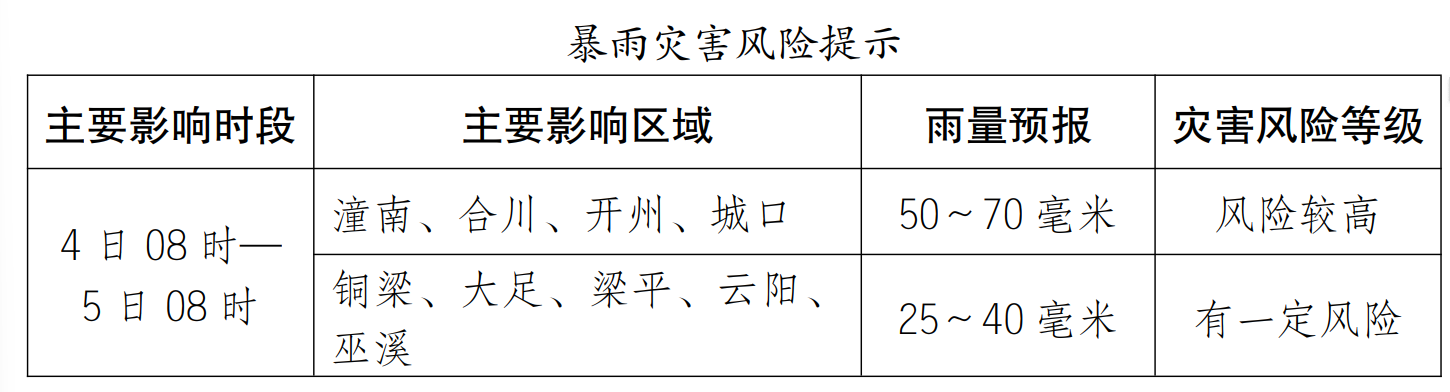 据重庆市气象台预计,10月 4 日,长江沿线以北地区小到中雨,局地大到暴雨 (30~70 毫米);叠加前期降雨影响,东北部和西北部部分地区地 质灾害、中小河流洪水气象风险较高,注意防范。5—6 日,大部 地区多云到晴。