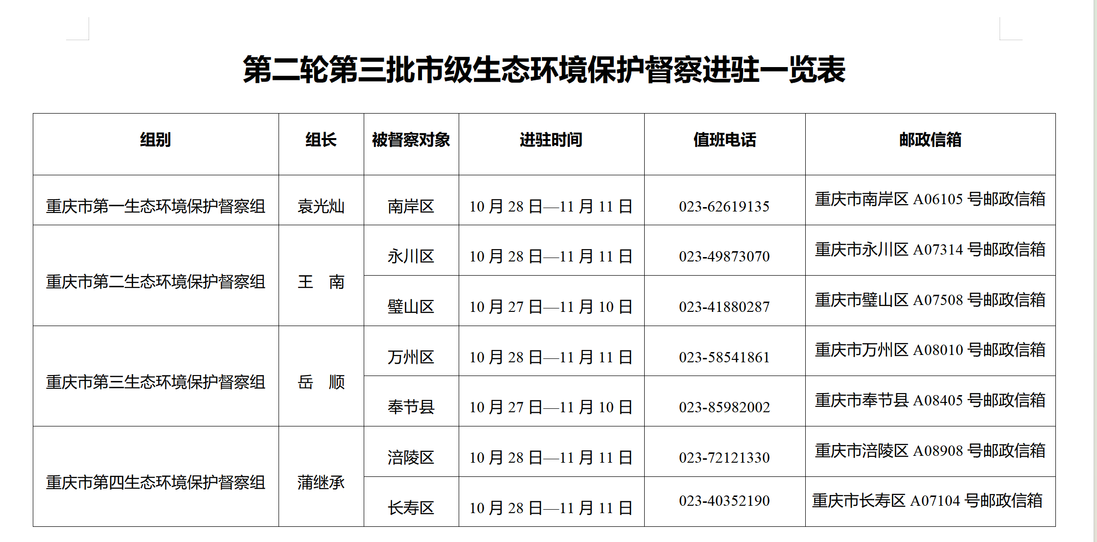 根据工作安排,重庆市第二轮第三批生态环境保护例行督察进驻时间为15天。进驻期间,各督察组分别设立专门值班电话和邮政信箱,受理被督察对象生态环境保护方面的来信来电信访举报,受理举报电话时间为每天8:00—20:00。督察组全体成员将严格执行纪律要求,接受被督察对象和社会监督。在后续工作中,督察组将严格落实为基层减负有关要求,进一步完善方式方法、简化工作流程,实现减负不减压、督察增实效,不断提高督察工作的精准性、针对性,确保有序有效完成督察任务。