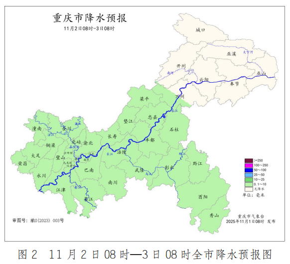 11月2日白天到夜间(2日08时~3日08时),中西部偏南和东南部地区阴天有间断小雨或零星小雨,其余地区阴天间多云转间断小雨或零星小雨,气温10~22℃;中心城区阴天转间断小雨,气温15~18℃。