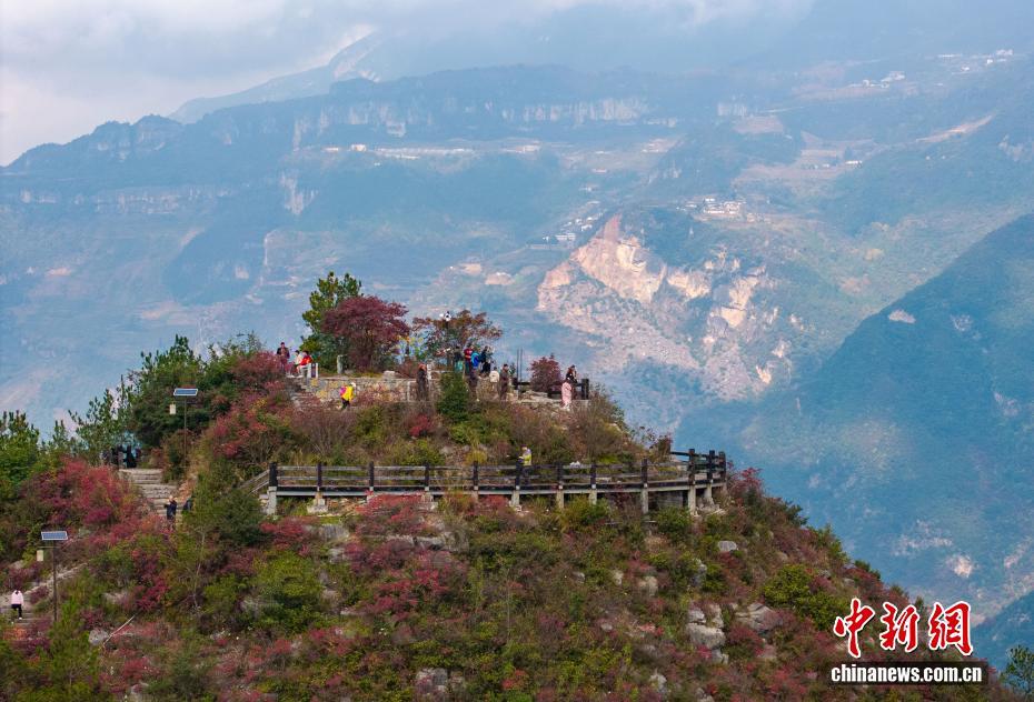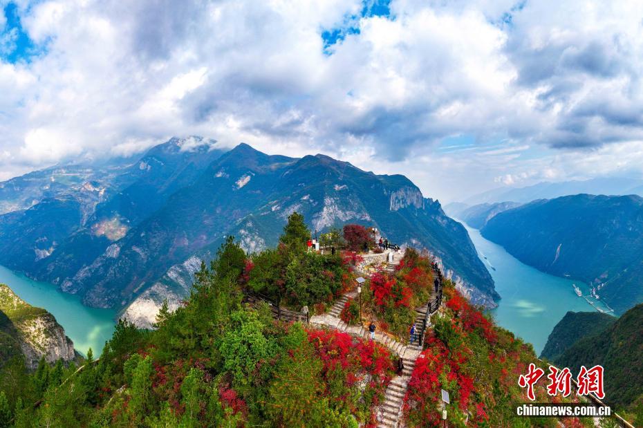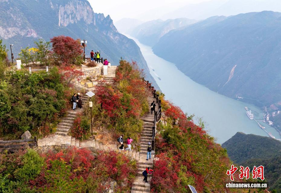 满山红叶似彩霞,彩霞年年映三峡。11月23日,重庆市巫山县境内的120万亩红叶次第变红,逐渐迎来最佳观赏期,吸引众多游客前来观赏、游玩。近年来,巫山县以长江三峡自然生长的红叶为媒,构建起集观赏、体验、互动于一体的文旅新业态。目前,“巫山红叶”已成为长江三峡旅游的一张名片。图为长江巫峡神女景区的红叶吸引游客前往参观。中新社记者 周毅 摄