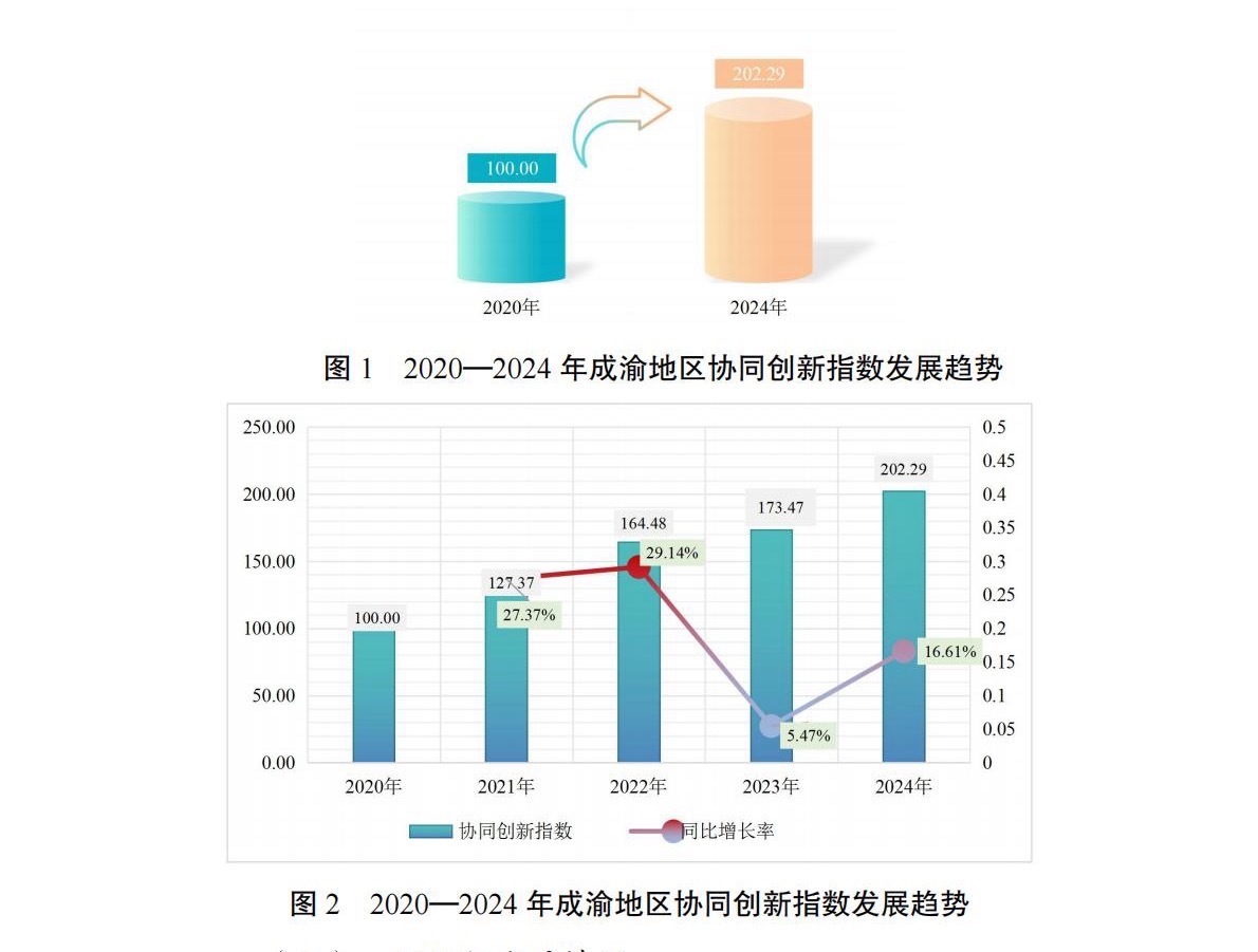 12月30日,2025年度重庆市区域与行业科技竞争力暨成渝地区双城经济圈协同创新指数成果发布会在重庆市科学技术研究院举行。现场发布的《2025成渝地区双城经济圈协同创新指数》(下称《成渝指数》)显示,自2020年以来,成渝地区协同创新能力稳步提升,协同创新总指数从2020年(基期)的100.00提升至2024年的202.29,年均增速达19.3%。