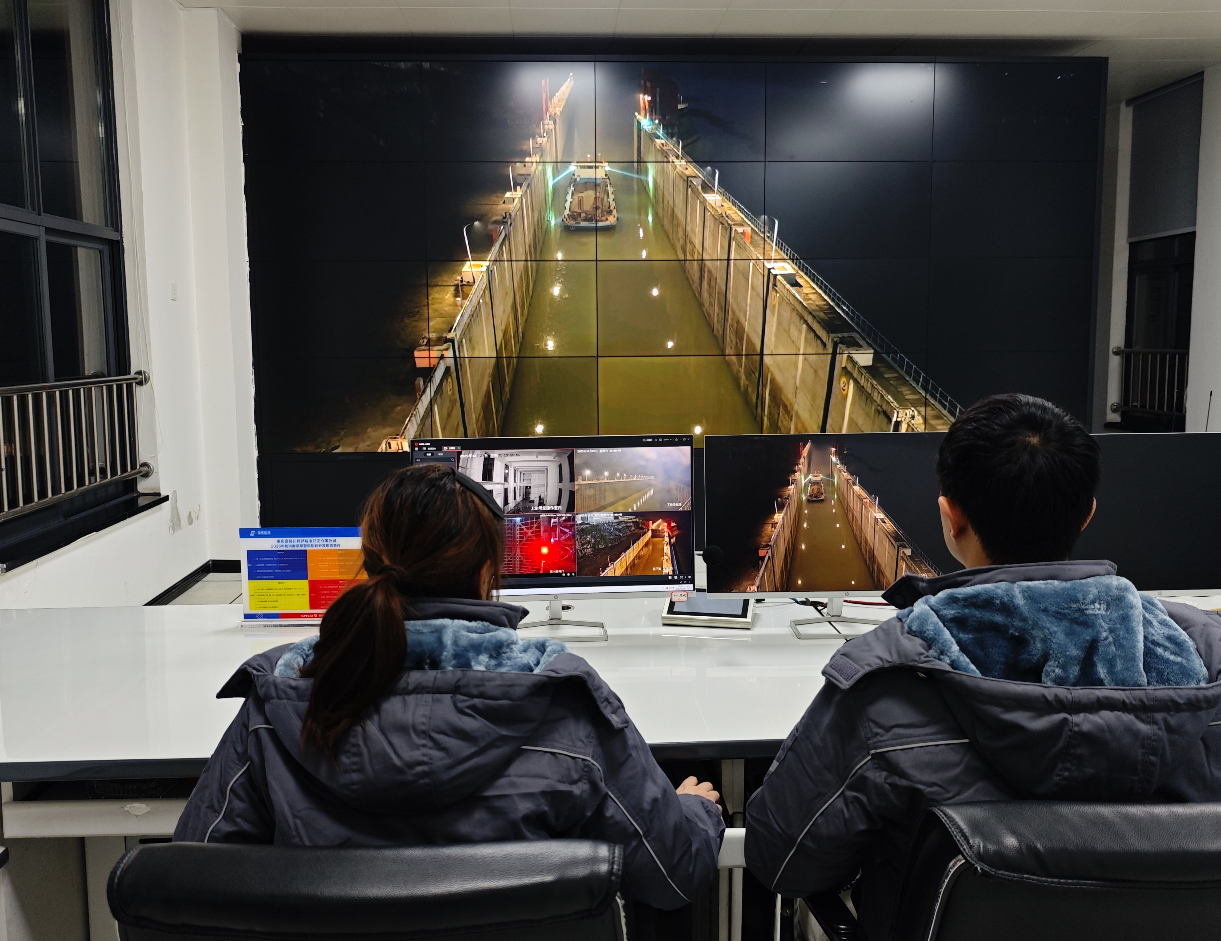 ▲2025年12月27日晚,利泽船闸中控室调度船舶进入闸室。(重庆航发集团供图)