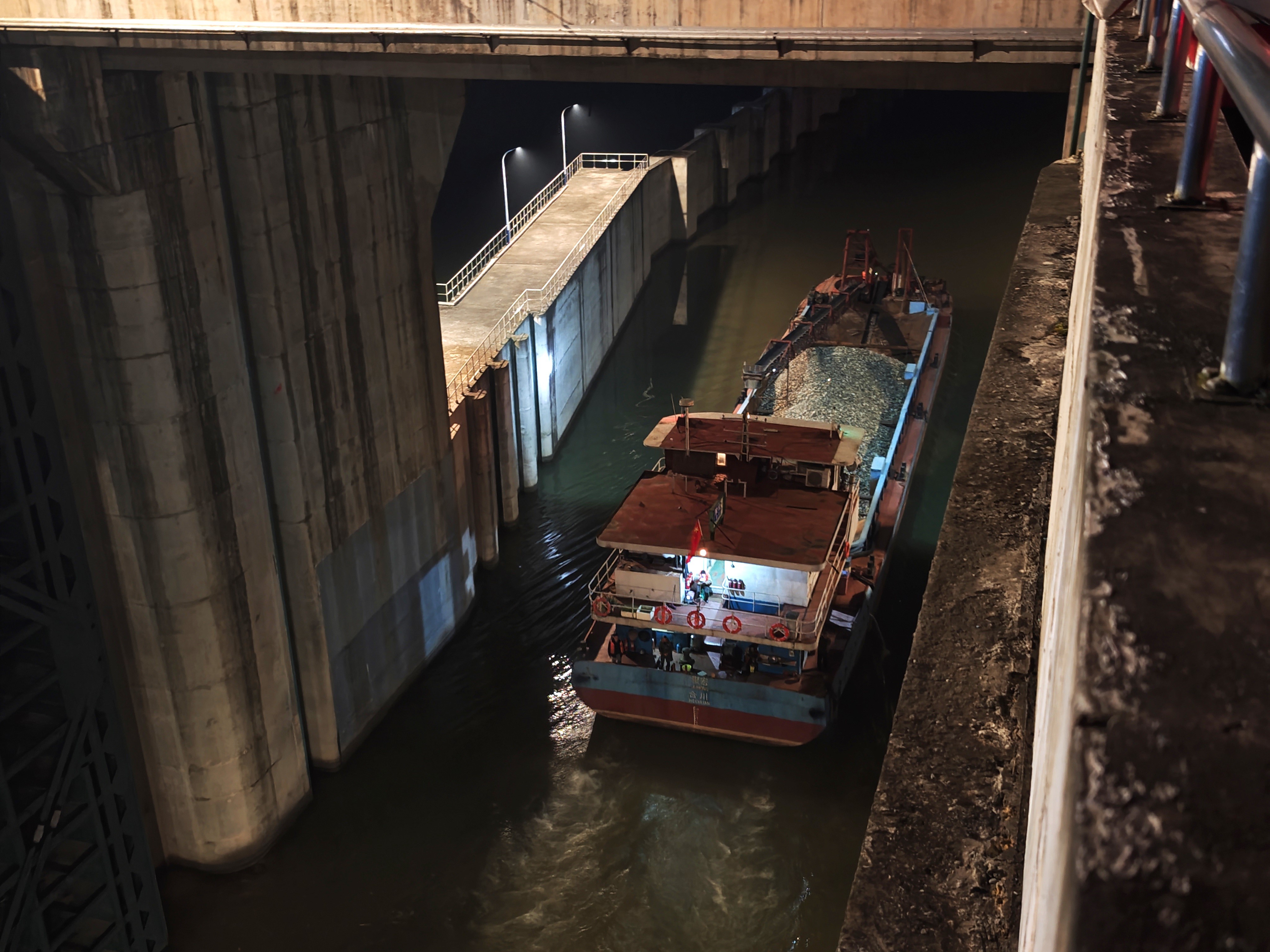 ▲2025年12月26日,实船试验船舶夜间通过嘉陵江草街船闸。(航发集团供图)