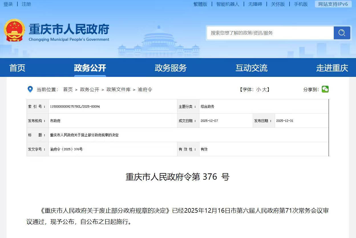 日前,市政府发布《重庆市人民政府关于废止部分政府规章的决定》(以下简称《决定》)。