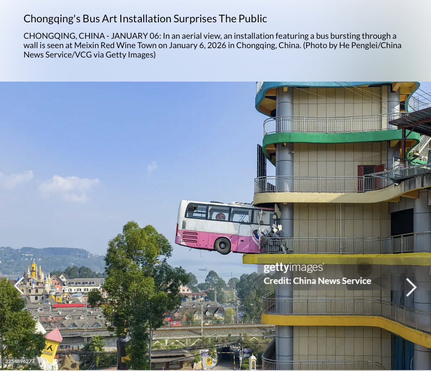“停靠在八楼的二路汽车,带走了最后一片飘落的黄叶……”刀郎经典歌词中令人遐想的场景,如今在重庆涪陵美心红酒小镇景区以极具冲击力的视觉效果呈现。近日,景区全新打造的“停在8楼的2路汽车”创意景观正式亮相,迅速从重庆长江之滨火遍国内外,成为重庆继李子坝轻轨穿楼后又一个爆款级文旅创意地标。