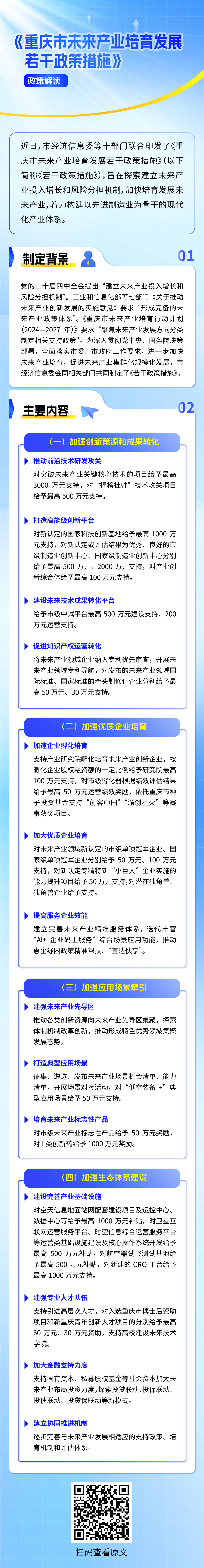 1月13日,市经信、发改、科技等10个市级部门联合印发《重庆市未来产业培育发展若干政策措施》(下称《措施》),将从平台建设、人才引育等多方面出台14条“政策干货”发展未来产业,其中对于突破未来产业关键核心技术的项目将给予最高3000万元支持。