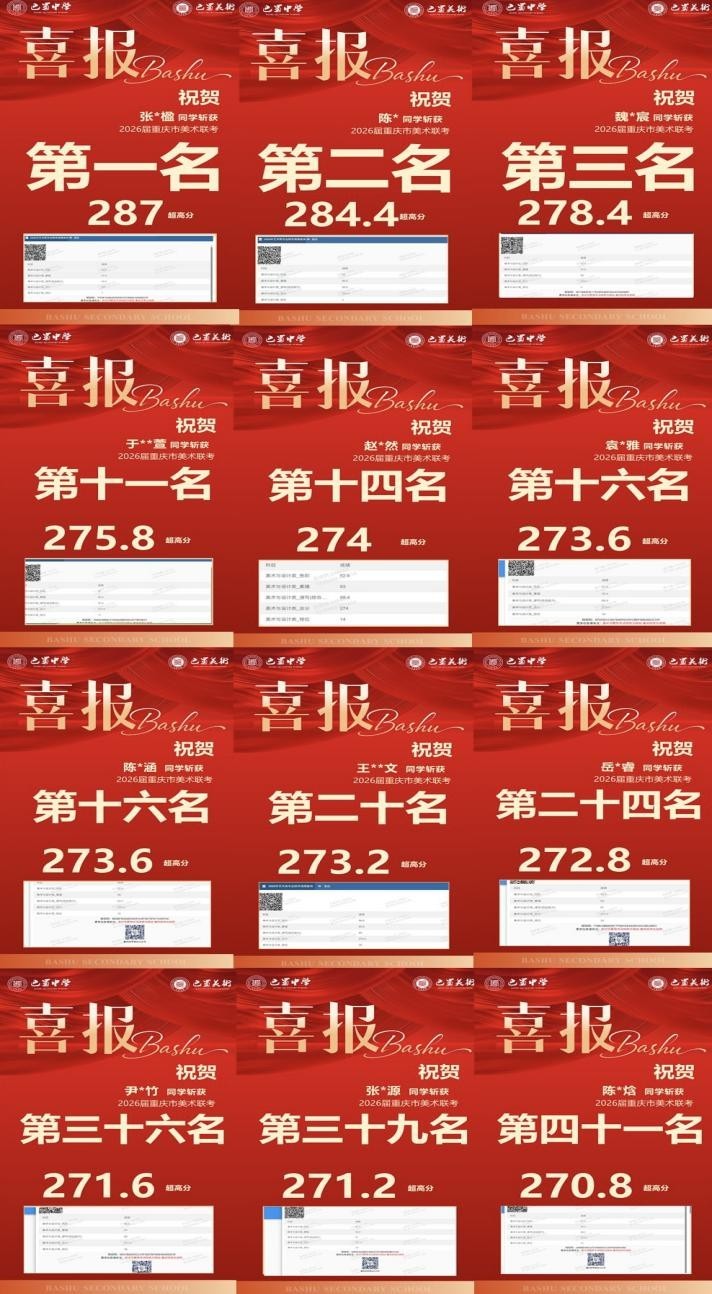 近日,年度美术联考成绩正式揭晓,重庆巴蜀中学美术特长生在本届联考中斩获佳绩。其中前三名全部包揽,前二十、前五十、前一百名都位居全市第一。