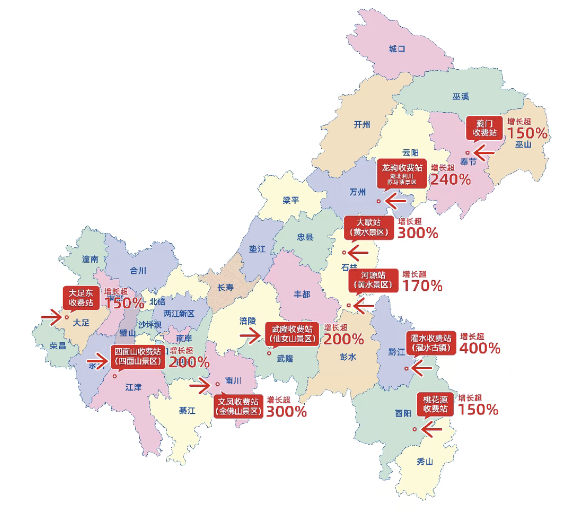 部分景区临近收费站流量增长明显,预计濯水收费站(濯水古镇)较平日增长超400%,文凤收费站(金佛山景区)较平日增长超300%;河源站和大歇站(黄水景区)较平日增长超170%和300%;龙驹收费站(湖北利川苏马荡景区)较平日增长超240%,武隆收费站(仙女山景区)较平日增长超200%;四面山收费站(四面山景区)较平日增长超200%;夔门、桃花源、大足东收费站较平日涨幅超150%。