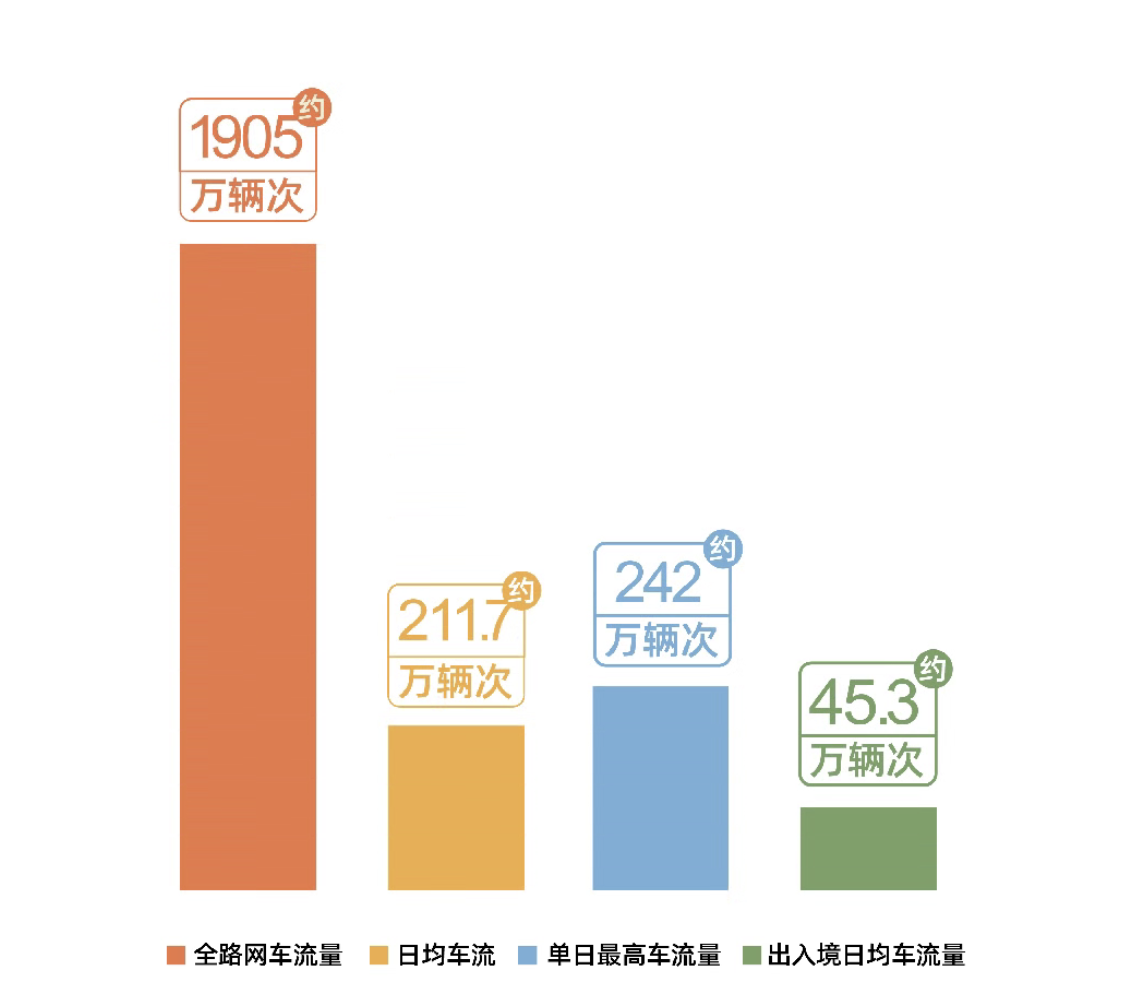 2月22日单日车流最高,预计达242万辆次。出入境日均车流量约45.3万辆次,其中入境日均车流量约22.5万辆次,出境日均车流量约22.8万辆次。