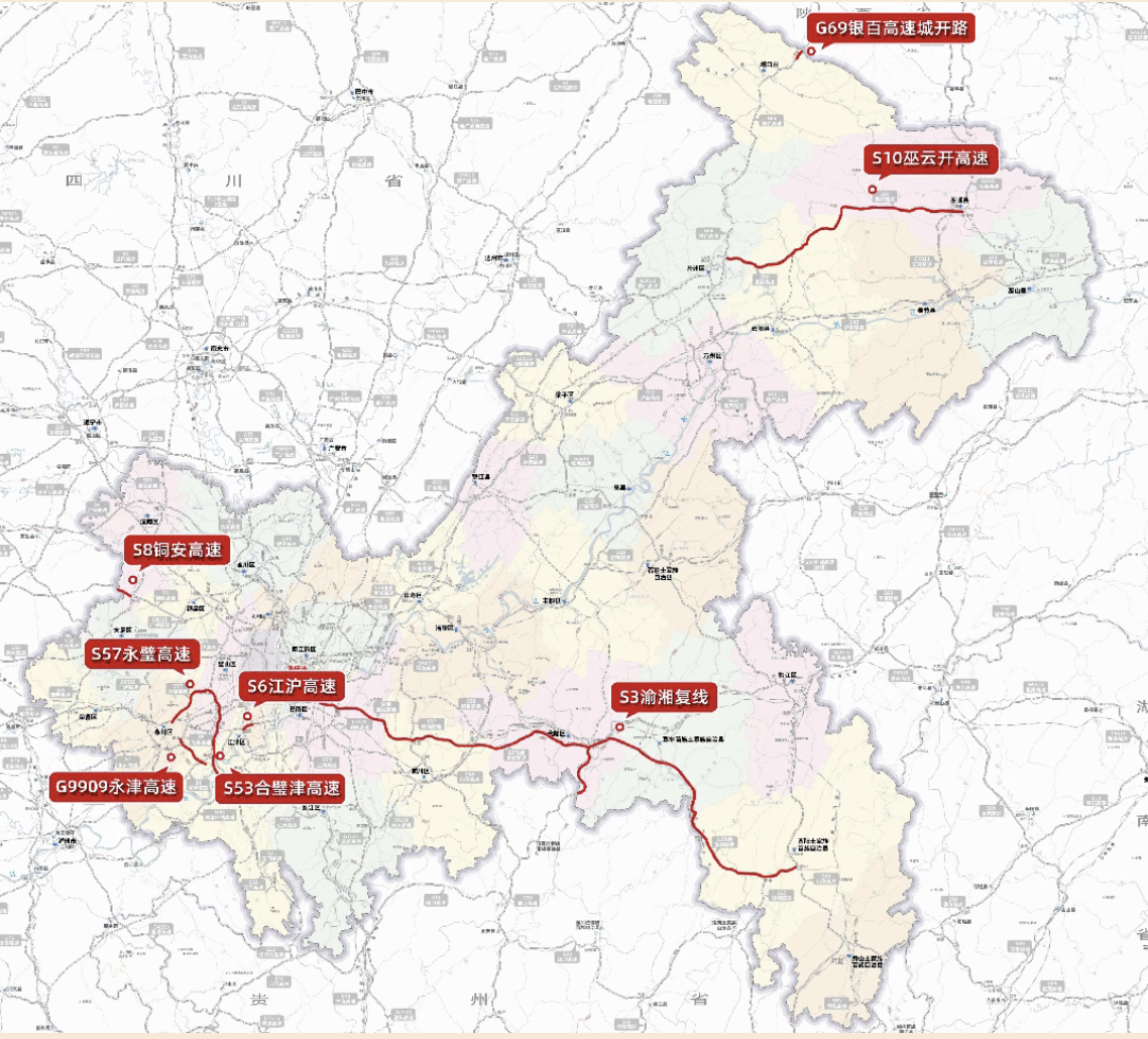 截至2025年底,全市高速公路通车里程达4780公里。2025年新开通498公里,已实现通往陕西省的G69银百高速城开路、通往贵州省的S31武道路、通往四川的S55潼荣高速以及S8铜安高速,通车省界通道达到32个,真正实现了“四通八达”。