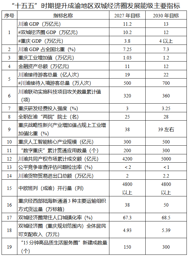 新重庆-重庆日报记者注意到,行动方案(公开征求意见稿)中提出了具体的发展目标:锚定到2030年高质量建成全国区域发展“第四极”的总体目标,全面增强成渝地区双城经济圈经济承载和辐射带动、创新资源集聚和转化、改革集成和开放门户、人口吸纳和综合服务功能,大幅提升双城经济圈综合实力,加快迈入具有国际影响力的现代化城市群行列。