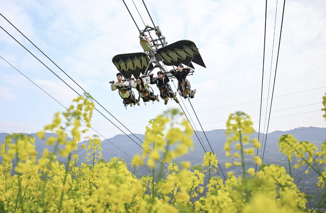 索道2号线为6人封闭式轿厢,横跨长江支流,路线便捷且对恐高人士十分友好,乘坐其间可欣赏两岸春日绿植与江景,中途换乘平台还有免费无动力游乐项目,适合全家同行休憩游玩;索道3号线采用五颜六色的双人吊篮设计,线路绵长,爬升角度陡峭,最长可乘坐40余分钟,沿山而上,搭配青山绿植,出片率拉满,终点可直达乡村振兴集市,解锁田园春日乐趣。索道5号线采用黑白吊篮轿厢交叉混合设计,线路绵长,中途站台为可爱的小黄鸭造型,打卡氛围感十足,终点直达水库站点,可解锁平湖春色体验,在湖光山色中感受春日静谧;索道6号线与7号线相邻布局,其中7号线为刺激的“空中超人”飞鹰滑索,乘坐时身体与地面平行,解锁高空自由感和垂直观江及鸟瞰油菜花体验,适合追求刺激的年轻群体,6号线则为温馨的飞行屋造型索道,兼顾趣味性与安全性,适合各个年龄段游客体验。7条索道首尾相连,形成空中环线,将鸡公山乐园、生态葡萄园、乡村集市等核心景点串成一幅立体春日画卷,让游客一站式解锁高空赏春的多样乐趣。